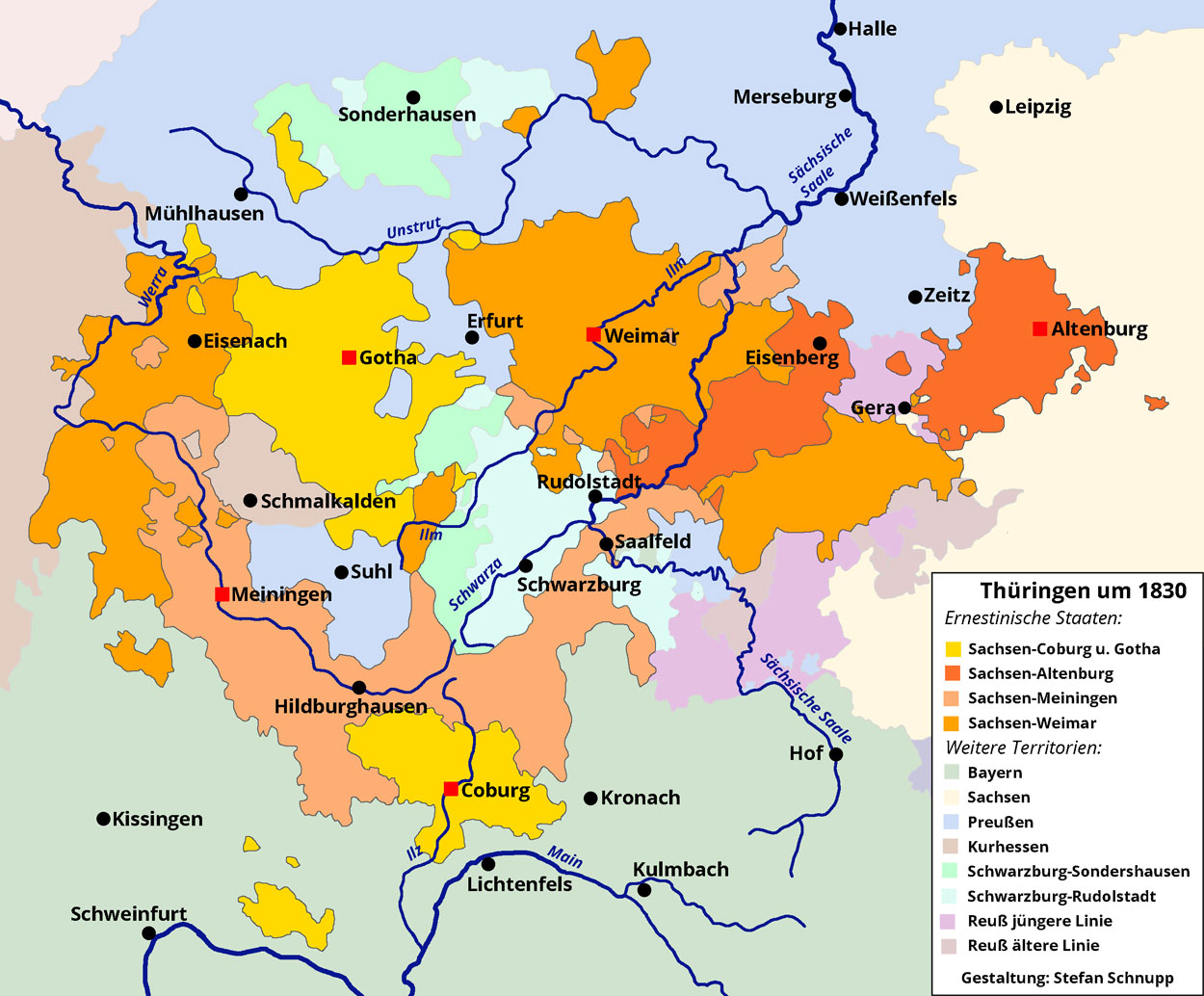 Karte von Thüringen um 1830 nach der Hildburghauser Teilungen von 1826. (Gestaltung: Stefan Schnupp) HLB