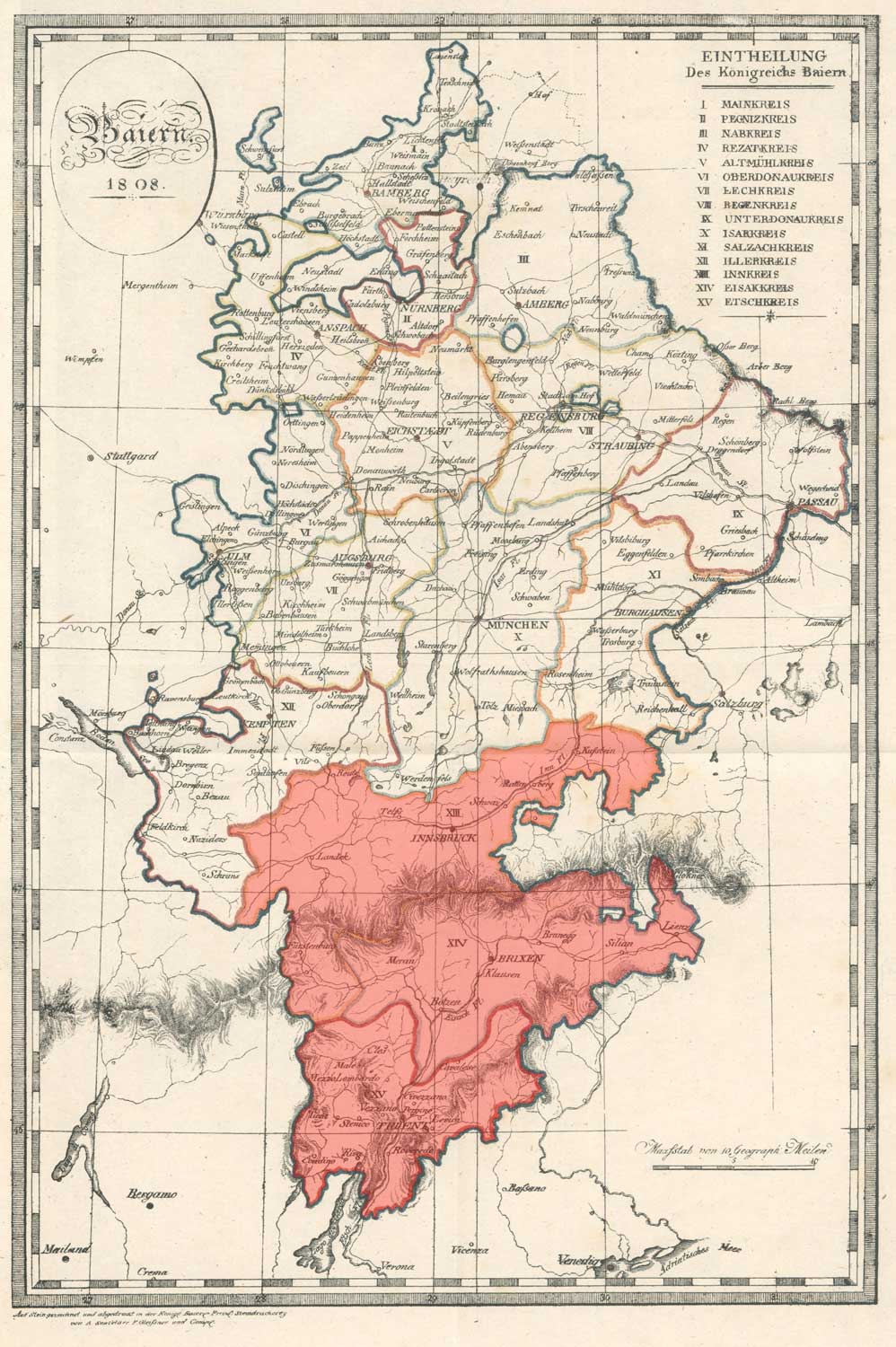 Karte des Königsreichs Bayern und seiner 15 Kreise von 1808. Die vormalige Grafschaft Tirol (hier rote markiert) wurde in drei Kreise geteilt . Abb. aus: Alois Senefelder u.a., Das Königreich Baiern. In fünfzehen Kreise eingetheilt, nebst einer Uebersichts-Karte, München 1809. (Bayerische Staatsbibliothek, Mapp. XI,50 o-16)