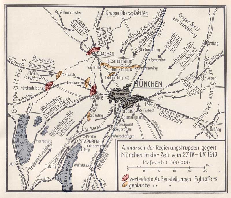 Die Karte zeigt die Truppenbewegungen auf München und Verteidigungsstellungen der Roten Armee, Ende April 1919 (nachträglich coloriert). Abb. aus: Das Bayerland 44 (1933), 597. (Bayerische Staatsbibliothek, 4 Bavar. 198 t-44)