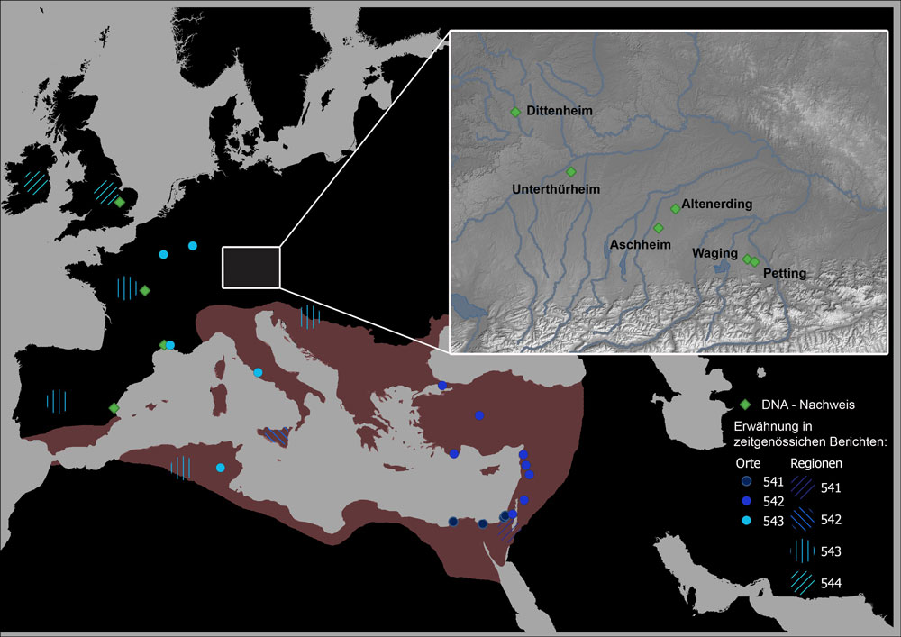 Räumliche Verteilung der Erwähnung der Justinianischen Pest in historischen Quellen (Angaben nach Keller et al. 2019) und der Nachweise mittels naturwissenschaftlicher Methoden (Stand 2022). Die ungefähre Ausdehnung des Justinianischen Reiches ist rötlich eingefärbt (größte Ausdehnung im 6. Jh. AD). Ausschnitt: Gerade in Bayern konzentrieren sich viele molekulargenetische Nachweise. Dies spiegelt das langjährige Forschungsinteresse der Staatssammlung für Anthropologie in München und damit den Forschungstand wieder. Es ist zu vermuten, dass sich zukünftig auch für andere Regionen die Nachweise häufen werden. (Karte: M.Harbeck, erstellt mit QGis, Kartendaten: WMS Digital Terrain Model, Data licence Germany – attribution – Version 2.0). HLB