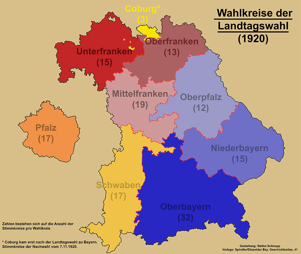 Wahlkreise für die Landtagswahl 1920. (Gestaltung: Stefan Schnupp, Vorlage: Spindler/Diepolder Bay. Geschichtsatlas, 40)