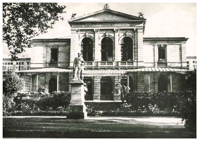 Bad Kissingen-Kurparkkasino mit König-Maximilian-Denkmal. Postkarte von 1965 aus der Sammlung Josef Bötsch. Foto: Gerhard Fuhrmann. (Stadtarchiv Bad Kissingen) HLB