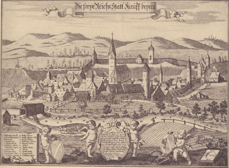 Die freie Reichsstadt Kaufbeuren im Jahre 1708 nach einem Kupferstich von Elias Bäck. Abb. aus: Das Bayerland, Jahrgang 36 vom Juni 1925, 333. (Bayerische Staatsbibliothek, 4 Bavar. 198 t-36) HLB