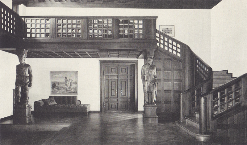 Ansicht der Diele in der Bibliothek der Kaulbach-Villa. Die Inneneinrichtung wurde vom Atelier Troost vorgenommen. Abb. aus: Bayerisches Staatsministerium des Innern: Arbeitsbericht für das Rechnungsjahr 1937, Anhang, 33. HLB