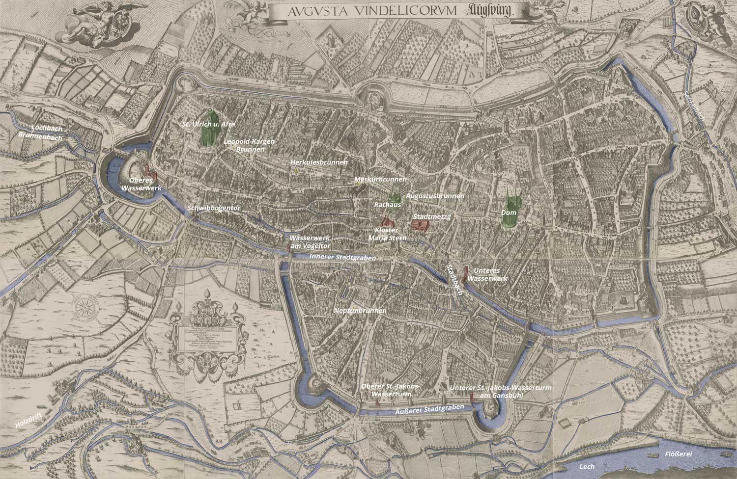 Vogelschauplan Augsburgs: "Augusta Vindelicorum Augspurg“. Kupferstich von Wolfgang Kilian (1581-1662), 1626. Zusammengesetzter Vollplan inkl. farbiger Bearbeitung der Kanäle und erwähnten Brunnwerke/Bauwerke und Springbrunnen. (Bayerische Staatsbibliothek Bildarchiv, port-000308 bis port-000315) HLB