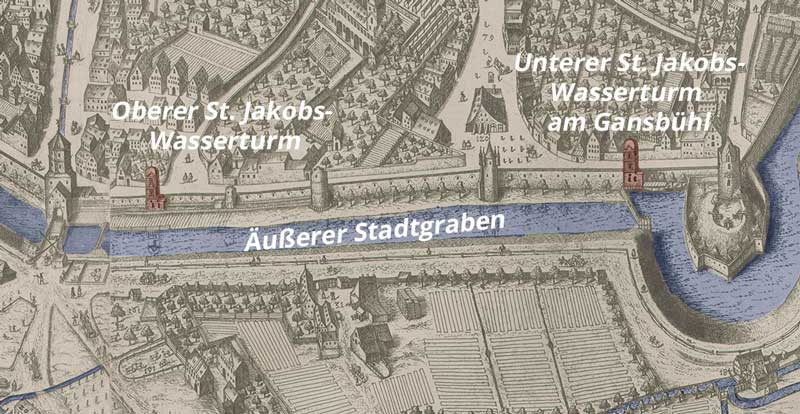 Vogelschauplan Augsburgs: "Augusta Vindelicorum Augspurg“. Ausschnitt mit den St. Jakobswasserwerken. Kupferstich von Wolfgang Kilian (1581-1662), 1626. Zusammengesetzter Vollplan inkl. farbiger Bearbeitung der Kanäle und erwähnten Brunnwerke/Bauwerke und Springbrunnen. (Bayerische Staatsbibliothek Bildarchiv, port-000308 bis port-000315) HLB