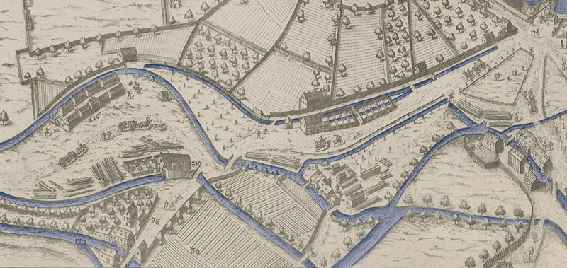 Vogelschauplan Augsburgs: "Augusta Vindelicorum Augspurg“. Ausschnitt der Wirtschaftlichen Nutzung am unteren Bildrand. Kupferstich von Wolfgang Kilian (1581-1662), 1626. Zusammengesetzter Vollplan inkl. farbiger Bearbeitung der Kanäle und erwähnten Brunnwerke/Bauwerke und Springbrunnen. (Bayerische Staatsbibliothek Bildarchiv, port-000308 bis port-000315) HLB