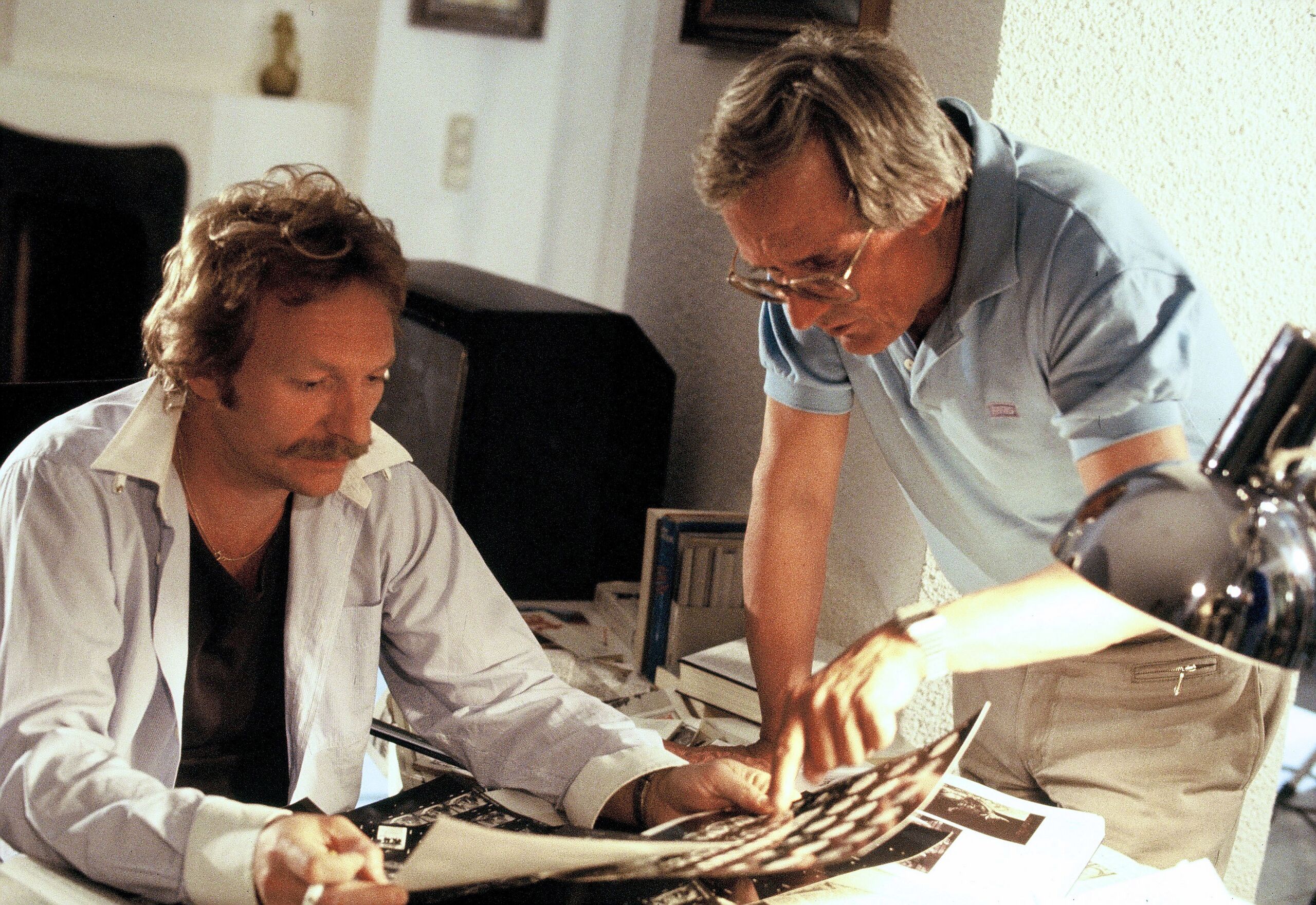 {{|1="Baby" Schimmerlos (Franz Xaver Kroetz, links) entscheidet als Gesellschaftsreporter bei der Münchner MATZ mit seinem Fotografen Herbie (Dieter Hildebrandt) darüber, hoffnungsvolle Aspiranten in die Bussi-Gesellschaft aufzunehmen oder auch wieder daraus zu entfernen. (© WDR/Balance Film)}}