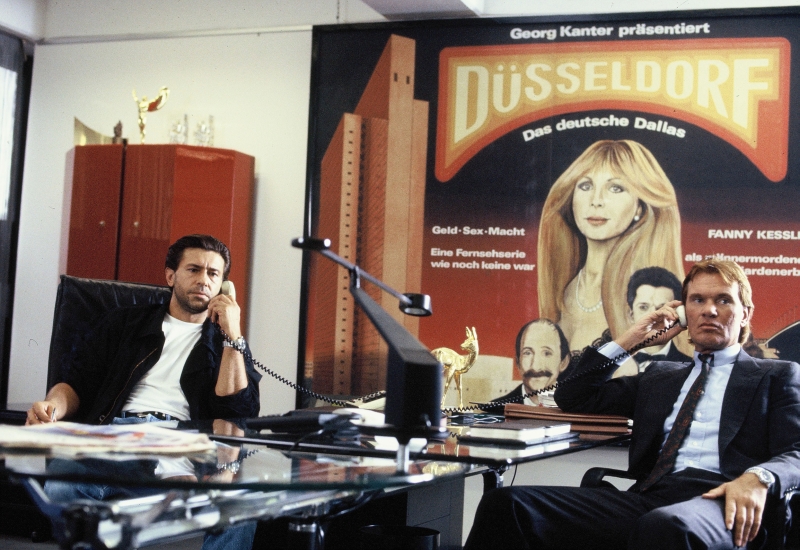 {{|1=Fanny Kessler (Christine Schuberth), die Hauptdarstellerin einer neuen TV-Seifenoper, soll angeblich schwanger sein. Filmproduzent Schorschi Kanter (Hanno Pöschl) und sein Mann fürs Grobe (Burkhard Driest) wollen verhindern, dass das publik wird. (© WDR/Balance Film)}}