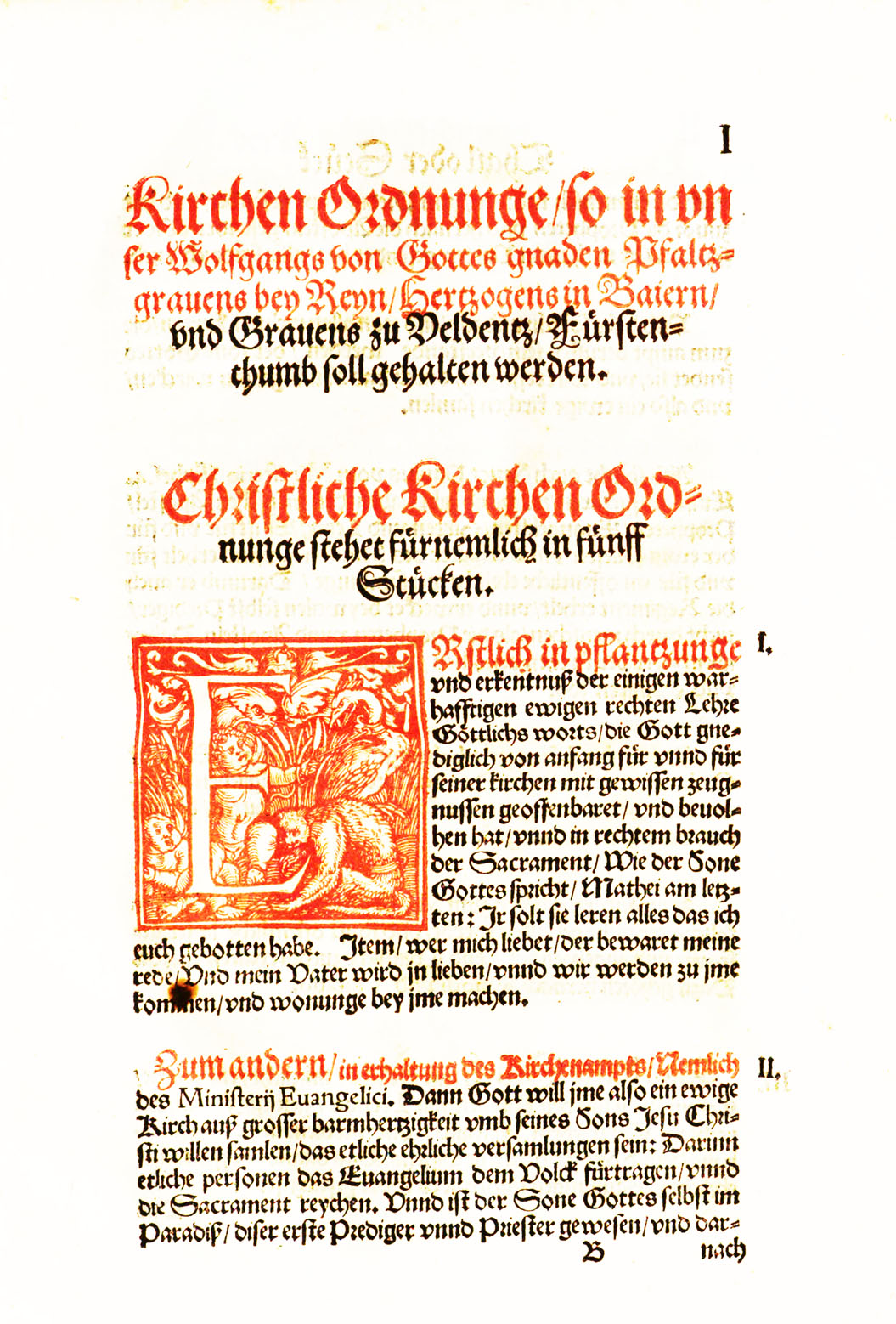 Die Kirchenordnung Herzog Wolfgangs aus dem Jahre 1557. 1555 hatte der Herzog seinen Kanzler Ulrich Sitzinger [1525-1574] mit der Ausarbeitung einer eigenen Kirchenordnung beauftragt. In den Jahren 1560, 1563, 1570 und 1600 wurde diese Kirchenordnung neu aufgelegt. (Bayerische Staatsbibliothek, 2 Liturg. 431)