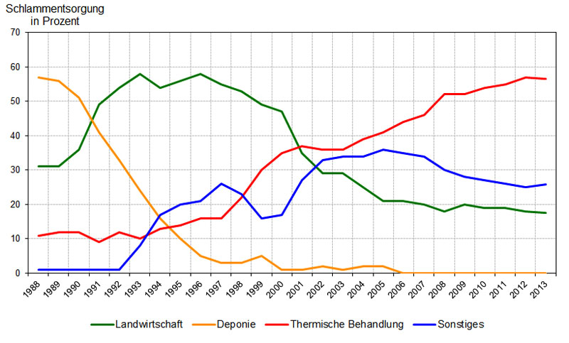 Klärschlammentsorgung in Bayern in der Zeit von 1988 bis 2013. Die landwirtschaftliche Verwertung, längere Zeit vor dem betrachteten Zeitraum und in den 1990er Jahren mit einem hohen Anteil findet seit etwa 2005 nur noch bei kleinen Kläranlagen in ausgeprägten landwirtschaftlich geprägten Gebieten statt. Die Deponierung hat seit 1990 steil abgenommen und ist seit 2005 nicht mehr zulässig. Die thermische Verwertung steigt seit Mitte der 1990er Jahre stetig an und erreicht nach 2013 über 60 %. Die sonstige Verwertung (insbesondere Landschaftsbau und Rekultivierung) setzte zu Beginn der 1990er Jahre ein und pendelt um 2015 bei gut 20 %. (aus: Bayerisches Landesamt für Umwelt, Lagebericht Gewässerschutz 2014, 17)