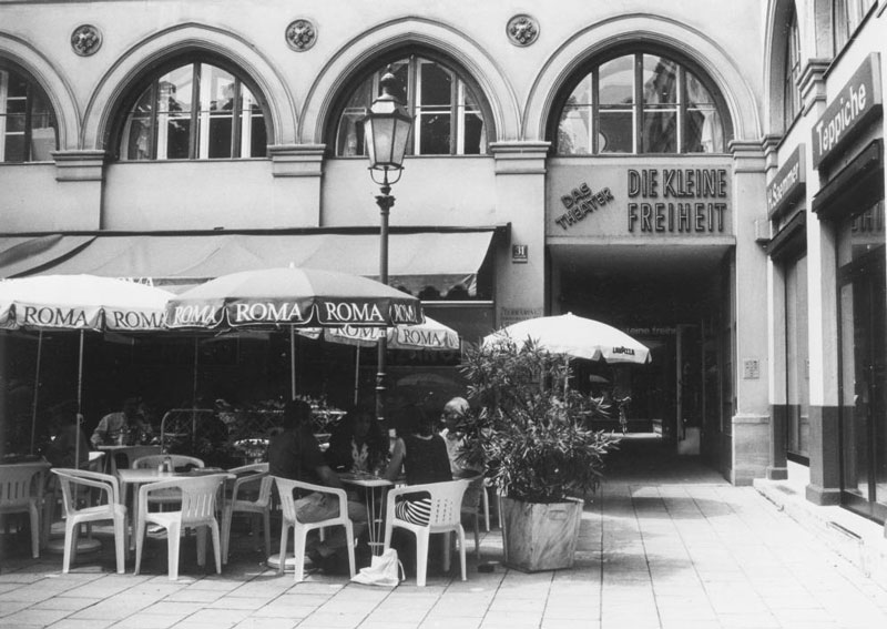 Außenansicht der "Kleinen Freiheit" in der Maximilianstraße 31 neben dem Café Roma, 1991. Foto: Erika Kiechle-Klemt. (Stadtarchiv München, FS-STB-7667) HLB