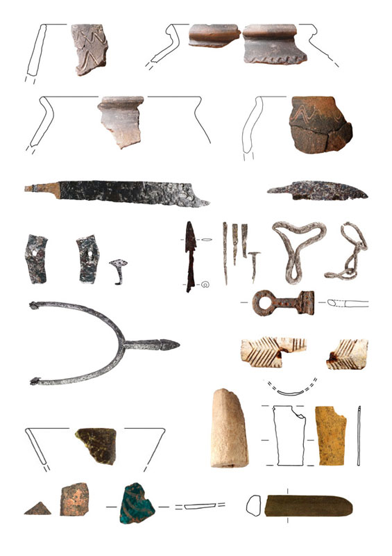 Auswahl an Kleinfunden der Ausgrabungen auf dem Veitsberg: Keramik, Metallfunde, bearbeitete Beinfragmente, Hohl- und Fensterglas, Schleifstein. (aus Wolters 2018) HLB