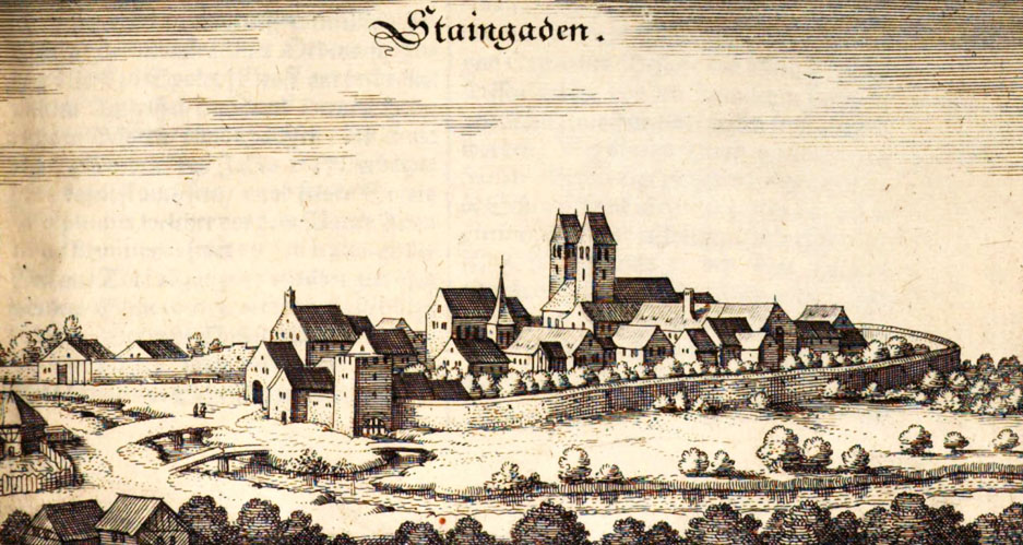 Kloster Steingaden auf einem Stich aus der ersten Hälfte des 17. Jahrhunderts. (Matthäus Merian, Topographia Bavariae, nach 130, Frankfurt a. M. 1644. Bayerische Staatsbibliothek, 2 Bibl.Mont. 1046-3/4)