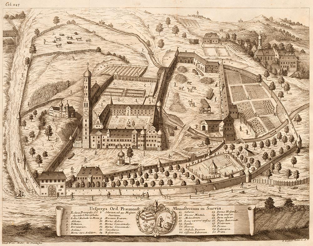 Die 1125 gegründete Reichsabtei Ursberg im Landkreis Günzburg. Stich, entstanden zwischen 1734 u.1736. (Hugo, Charles Louis: Sacri Et Canonici Ordinis Praemonstratensis Annales : In Duas Partes Divisi, Nancy 1734/36; Bayerische Staatsbibliothek, 2 H.mon. 8-1,1,1 u. 2 H.mon. 8-1,1,2)