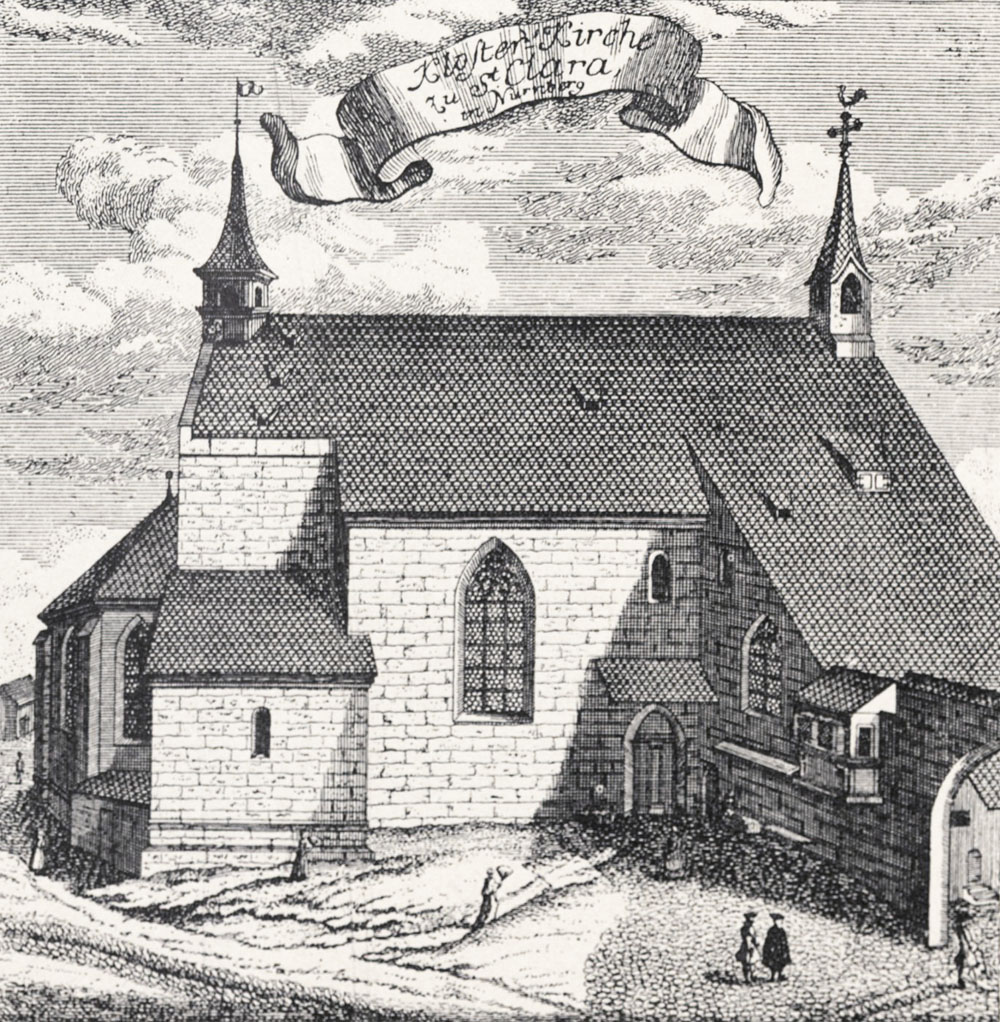 Die erste Überlieferung der Klosterkirche St. Klara stammt aus dem Jahre 1246. 1274 wurden der Hauptaltar und der Chor der heiligen Maria Magdalena geweiht. Damals war die Kirche noch im Besitz des Bettelordens der Reuerinnen. Nach dessen Auflösung kam die Kirche 1279 an den Klarissenorden. Die Kirche erhielt das Patrozinium der heiligen Klara von Assisi. Druck nach einem Stich von Cristoph Melchior Roth (1720-1798), 1760. (aus: Barbeck, Hugo: Alt-Nürnberg. Kulturgeschichtliche Bilder aus Nürnbergs Vergangenheit, Bd. 10: Kaufmann und Handel, Nürnberg 1896, Blatt 15. Bayerische Staatsbibliothek, 2 Bavar. 32 v-6/10)