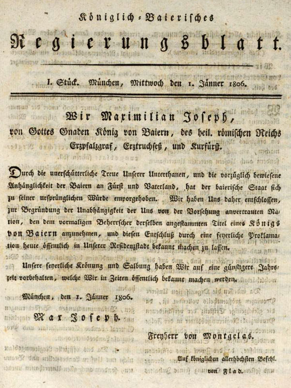Proklamation über die Erhebung des Kurfürsten Maximilian Joseph von Bayern zum König, München 1806. Abb. aus: Königlich-Baierisches Regierungsblatt, Nr. 1, 1. Januar 1806, 3. (Bayerische Staatsbibliothek, BHS VIII D 4-1806)