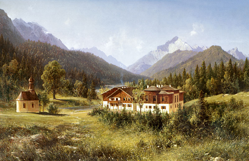 Gemälde des Königshäuschens mit Anbau und Anna-Kapelle von Julis Lange (1817-1878), 1872. Königshaus am Schachen. (© Bayerische Schlösserverwaltung, Lucinde Weiss, München) HLB