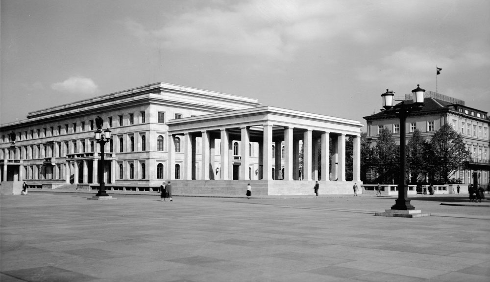 Blick vom Münchner Königsplatz auf einen der beiden sog. "Ehrentempel", den sog. "Führerbau" und das sog. "Braune Haus". Rund um das Braune Haus, seit 1931 Parteizentrale der NSDAP, entstanden zahlreiche Verwaltungs- und Repräsentationsbauten der NSDAP, darunter der "Führerbau" und der "Verwaltungsbau" an der Arcisstraße sowie 1935 die beiden sog. "Ehrentempel", in denen der sog. "Blutzeugen" (während des Hitlerputsches von 1923 getötete Nationalsozialisten) gedacht wurde. Der Königsplatz (während der NS-Zeit "Königlicher Platz") entwickelte sich zu einer der zentralen Platzanlagen Münchens, die die Nationalsozialisten für diverse Inszenierungen nutzten. Foto um 1935. (Bayerische Staatsbibliothek, Bildarchiv hoff-69493)
