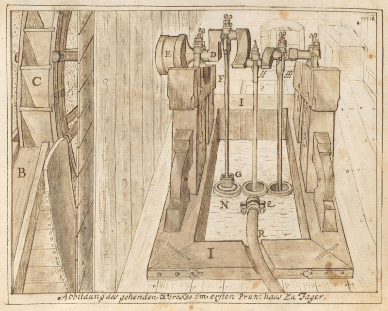 Darstellung der Kolbendruckpumpe, die Baumeister Simon Reiffenstuel (1574-1620) für das Brunnhaus in Reichenhall konstuierte. (Abb. aus: Anonius Stegburcher, Kurtze Beschreibungen was gestalten der Genadenreiche Salz-Prunen in dem Prun-Haus Reichenhallurcher, s.l. 1700, Bayerische Staatsbibliothek Cgm 6226) HLB