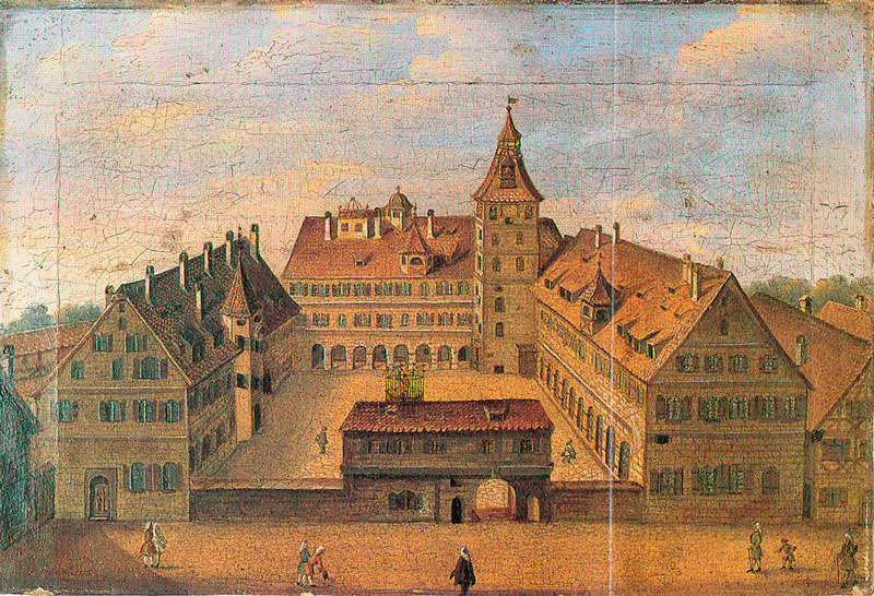 Eine der bekanntesten Ansichten der Altdorfer Universität vor dem Niedergang und der Auflösung der berühmten Bildungsstätte. Johann Georg Puschner um 1714. (Stadtarchiv Altdorf) HLB