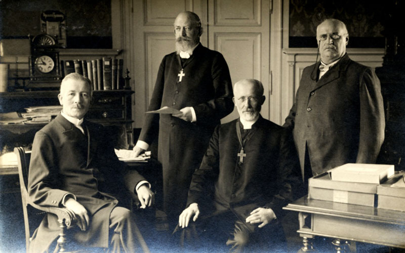 Kollegium des Landeskirchenrats, 1921, v.l.n.r.: Kirchenpräsident Karl Heinrich Fleischmannm und die Oberkirchenräte Heinrich Trost, Heinrich Drescher, Jakob Esslinger. (Foto: Zentralarchiv der Ev. Kirche der Pfalz, Abt. 154 Nr. 713)