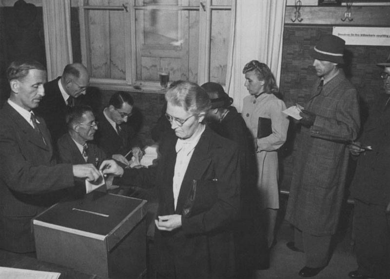 Kommunalwahl 1946 im Wahllokal an der Wendl-Dietrich-Straße in München. Foto: Hans Schürer. (Stadtarchiv München, DE-1992-FS-ERG-Q-1153) HLB