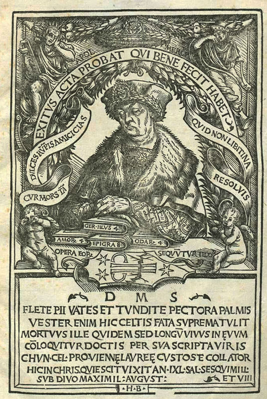 Konrad Celtis hatte maßgeblichen Anteil an der Gründung der Nürnberger Poetenschule (Holzschnitt von Hans von Kulmbach, aus: Cvspinianvs Celti Vltimvm Vale [1508]). (Bayerische Staatsbibliothek, [ http://daten.digitale-sammlungen.de/bsb00007950/image_7 Rar. 585])