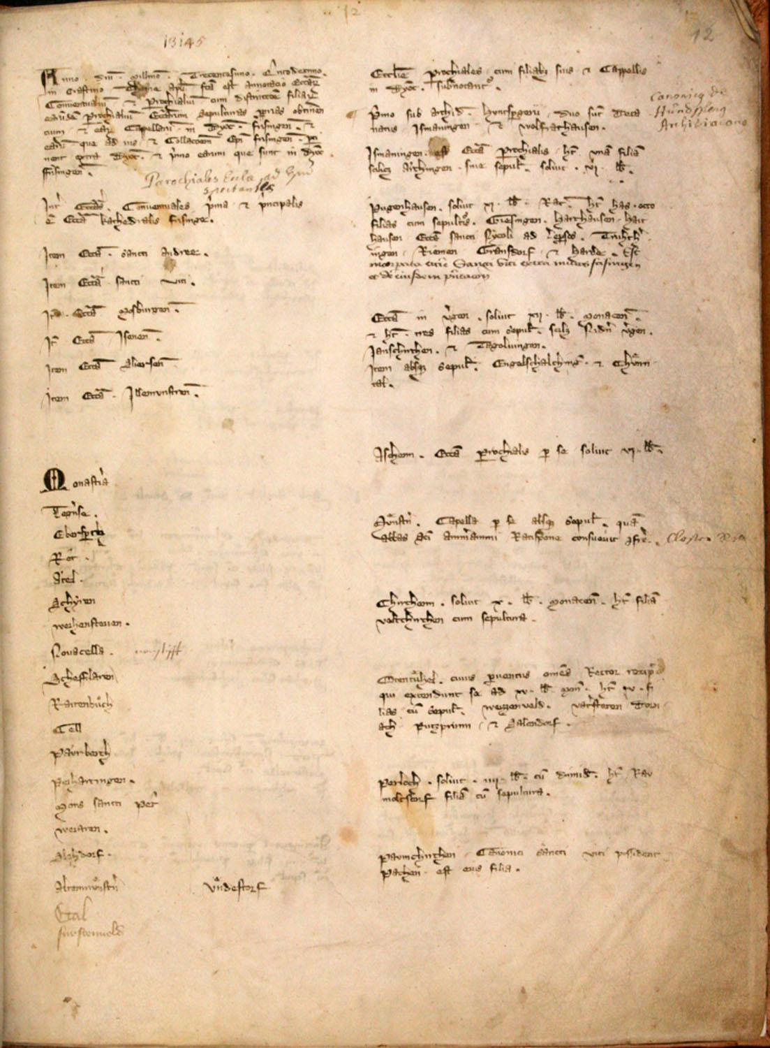 Eine Seite der "Konradinischen Matrikel". Hierbei handelt es sich um ein mittelalterliches Urbar des Bistums Freising das 1315/1316 angelegt wurde. Darin sind sämtliche Besitzungen fürstbischöflicher Güter mit ihren Einnahmen aufgeführt, sowie eine genaue Diözesanbeschreibung. (Archiv des Erzbistums München und Freising)