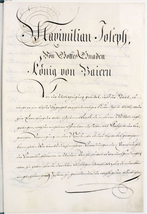 Titelseite der Konstitution des Königreichs Bayern, 1.5.1808. (Bayerisches Hauptstaatsarchiv, Bayerischer Landtag 10190 lizenziert durch CC BY-NC-ND 4.0 via bavarikon) HLB
