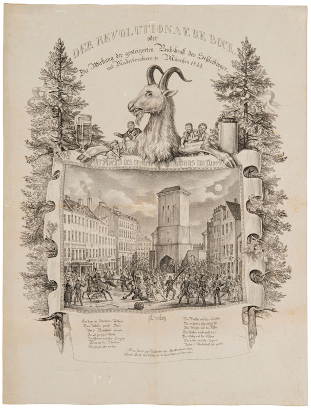 1844 führte eine Anhebung des Bierpreises zu Krawallen in der Münchner Innenstadt. Die satirische Grafik zeigte die Krawalle vor dem Münchner Isartor. Ludwig I. musste schließlich die Preiserhöhung zurücknehmen, um die viertägigen Unruhen zu beenden. Lithographie mit dem Titel: 'Der revolutionäre Bock' oder 'Die Wirkung der gesteigerten Bockskraft des Schleibinger- und Mauderbräubiers in München 1844' von Gustav Kraus (1804-1852), 1844. (Haus der Bayerischen Geschichte (Brückner, Maximilian)) HLB