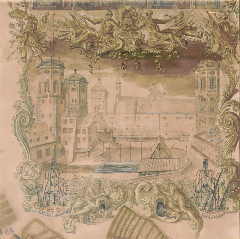 Innenhof des Oberen Wasserwerkes, Abbildung auf dem Plan "Typus Choro-Topographicus Liberae Sacri Rom. Imp. Civitatis Avgvstae Vindelicorvm" von Johann Ulrich Kraus (1655-1719), 1688. (PDM 1.0 via Staats- und Stadtbibliothek Augsburg, 13 H 1) HLB