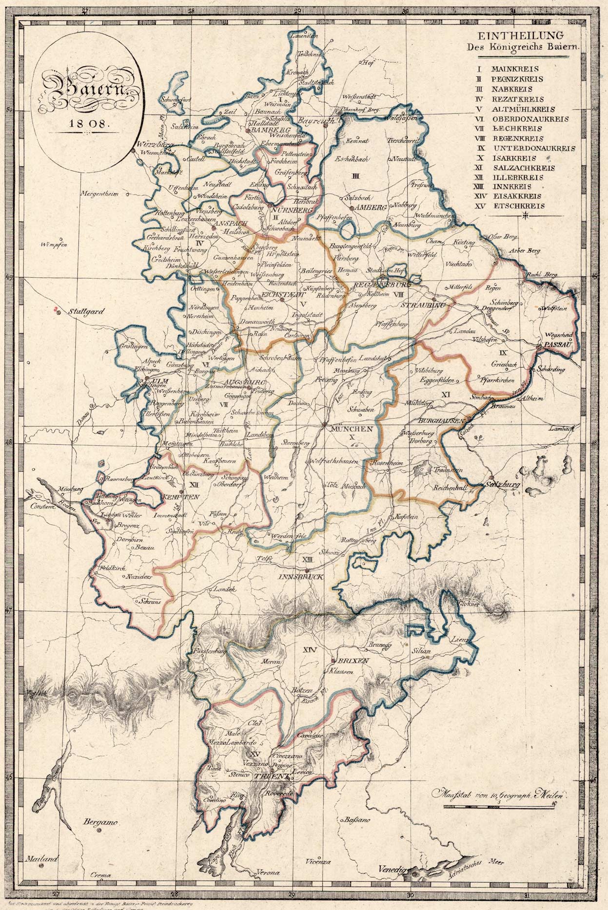 Karte der Kreiseinteilung Bayerns von 1808 München 1808. (Bayerisches Hauptstaatsarchiv, Kartensammlung 732) HLB