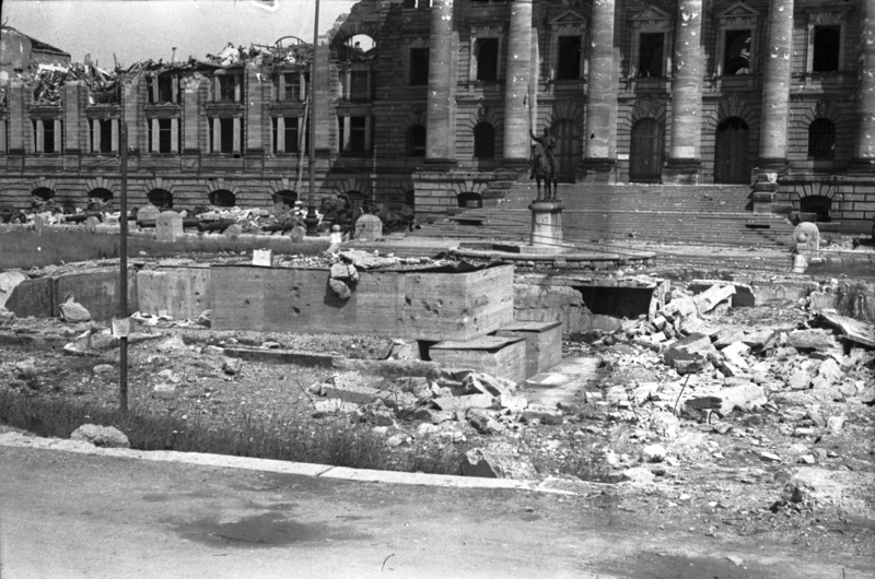 Das zerstörte Kriegerdenkmal vor dem bayerischen Armeemuseum. Foto: Tino Walz (1913-2008), 1945. (Bayerische Staatsbibliothek, Bildarchiv walz-0584) HLB