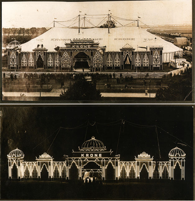 Die Fassade des Circus Krone, aufgenommen bei Tag und bei Nacht, während des Gastspiels in Berlin im Jahre 1931. (Foto: Verlag und Bildarchiv Richard Winkler)