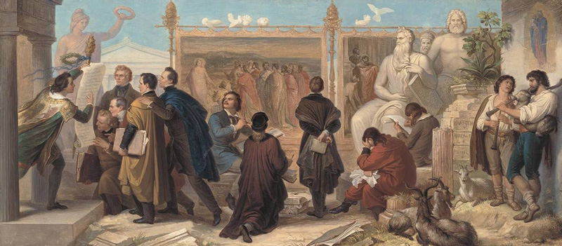 Mehrere Künstler erhalten Aufträge durch König Ludwig I. , Gemälde von Wilhelm von Kaulbach (1804-1874), datiert auf das Jahr 1848. (Bayerische Staatsgemäldesammlungen - Neue Pinakothek München, Inventarnummer WAF 408, lizenziert durch CC BY-SA 4.0) HLB