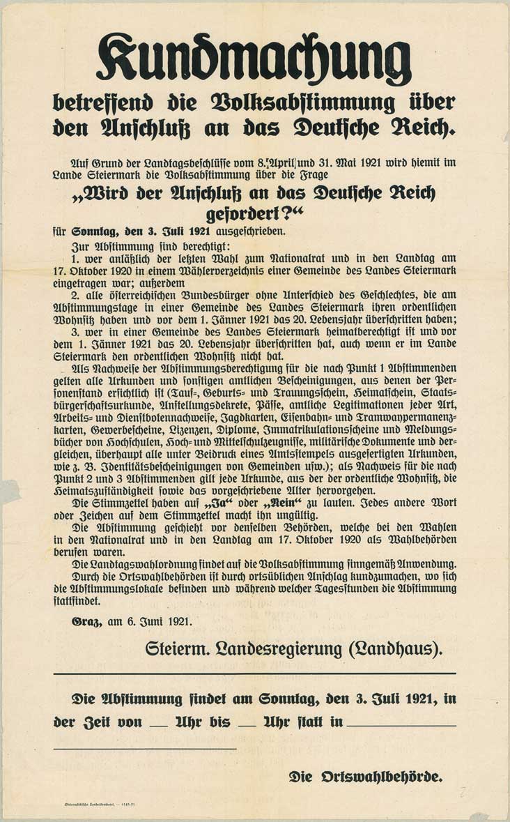 Blankokundmachung der Landesregierung für die Ortswahlbehörden über die Abstimmung zum Anschluss an Deutschland mit Erläuterungen zum Wahlgang: Kundmachung betreffend die Volksabstimmung über den Anschluß an das Deutsche Reich. Entstehungszeit: 1921. (Steiermärkisches Landesarchiv, Plakatsammlung, Pl-P-1921-0021) HLB