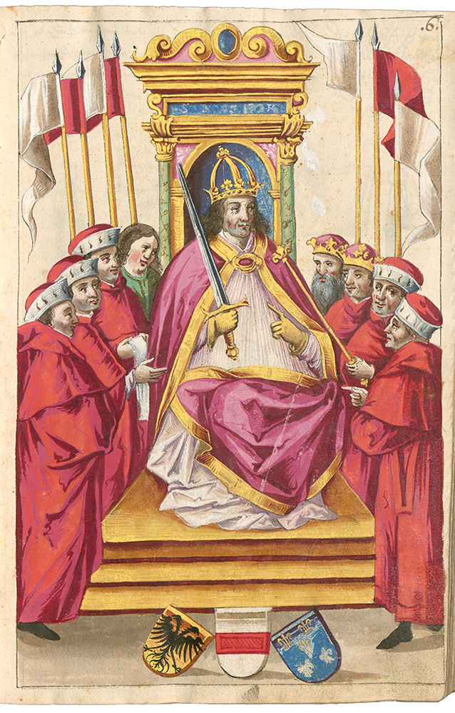 Kaiser im Kreise der Kurfürsten. Die Kurfürsten tragen alle den Kurhut, eine pupurfarbene Mütze mit breitem Hermelinreif als Zeichen ihrer hervorgehobenen Stellung. Miniatur aus dem Wappenbuch Konrads von Grünenberg, 1602-1604. (Bayerische Staatsbibliothek, Cgm 9210)