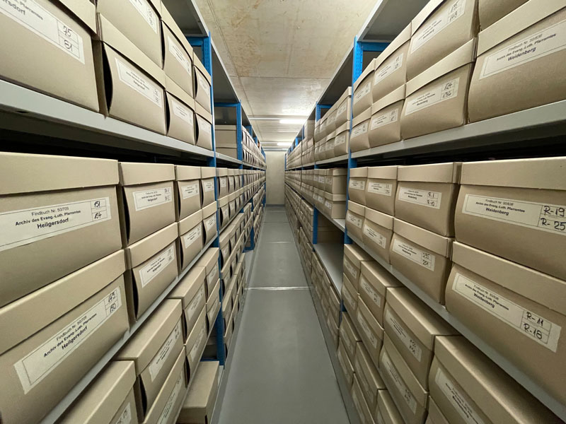 Aufnahme einer Regalreihe mit Archivkartons im Landeskirchlichen Archiv der ELKB in Nürnberg. (LAELKB, Foto: Celine Dürr) HLB