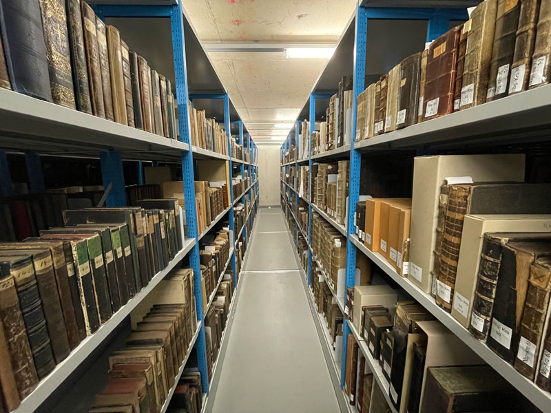 Aufnahme einer Regalreihe mit Kirchenbüchern im Landeskirchlichen Archiv der ELKB in Nürnberg. (LAELKB, Foto: Celine Dürr) HLB