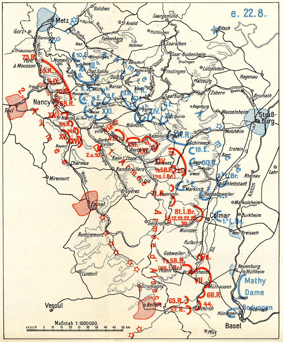 Karte mit Truppenbewegungen vom 22. August 1914. (Abb. aus: Karl Deuringer, Die Schlacht in Lothringen, Bd. 1, Lageskizzen, Blatt 1, e) HLB