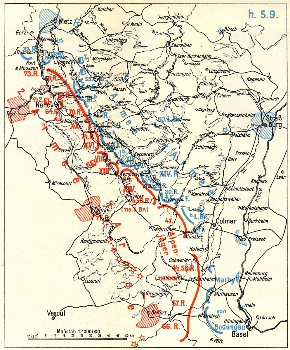 Karte mit Truppenbewegungen vom 5. September 1914. (Abb. aus: Karl Deuringer, Die Schlacht in Lothringen, Bd. 1, Lageskizzen, Blatt 1, h) HLB