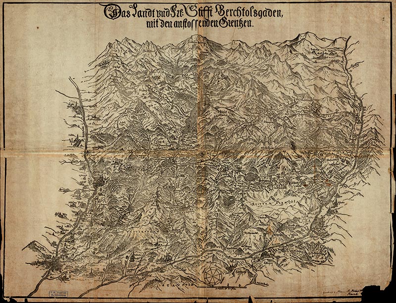 Landkarte aus 1628 "Das Landt und frl. Stifft Berchtolsgaden, mit den anstossenden Grentzen" von J. Mall. (Universitätsbibliothek Basel, Kartenslg Mappe 246:84) HLB