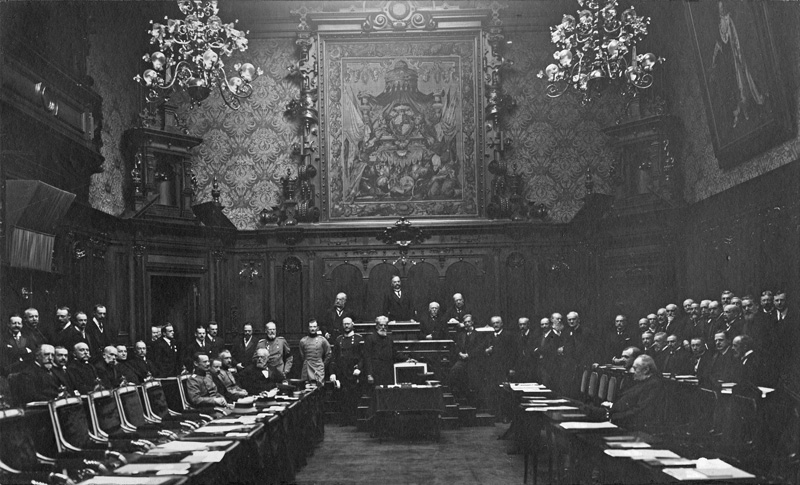 Sitzungssaal der Kammer der Reichsräte. Foto von 1912. (Bayerische Staatsbibliothek, Bildarchiv port-025989) HLB