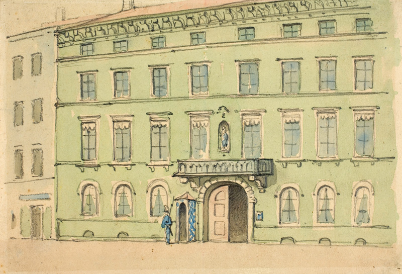 August Seidel, Landtagsgebäude an der Prannerstraße, um 1885, Aquarell und Bleistift. (Münchner Stadtmuseum, Sammlung Graphik/Gemälde, Inventarnummer G-31/471, lizenziert durch CC BY-SA 4.0) HLB