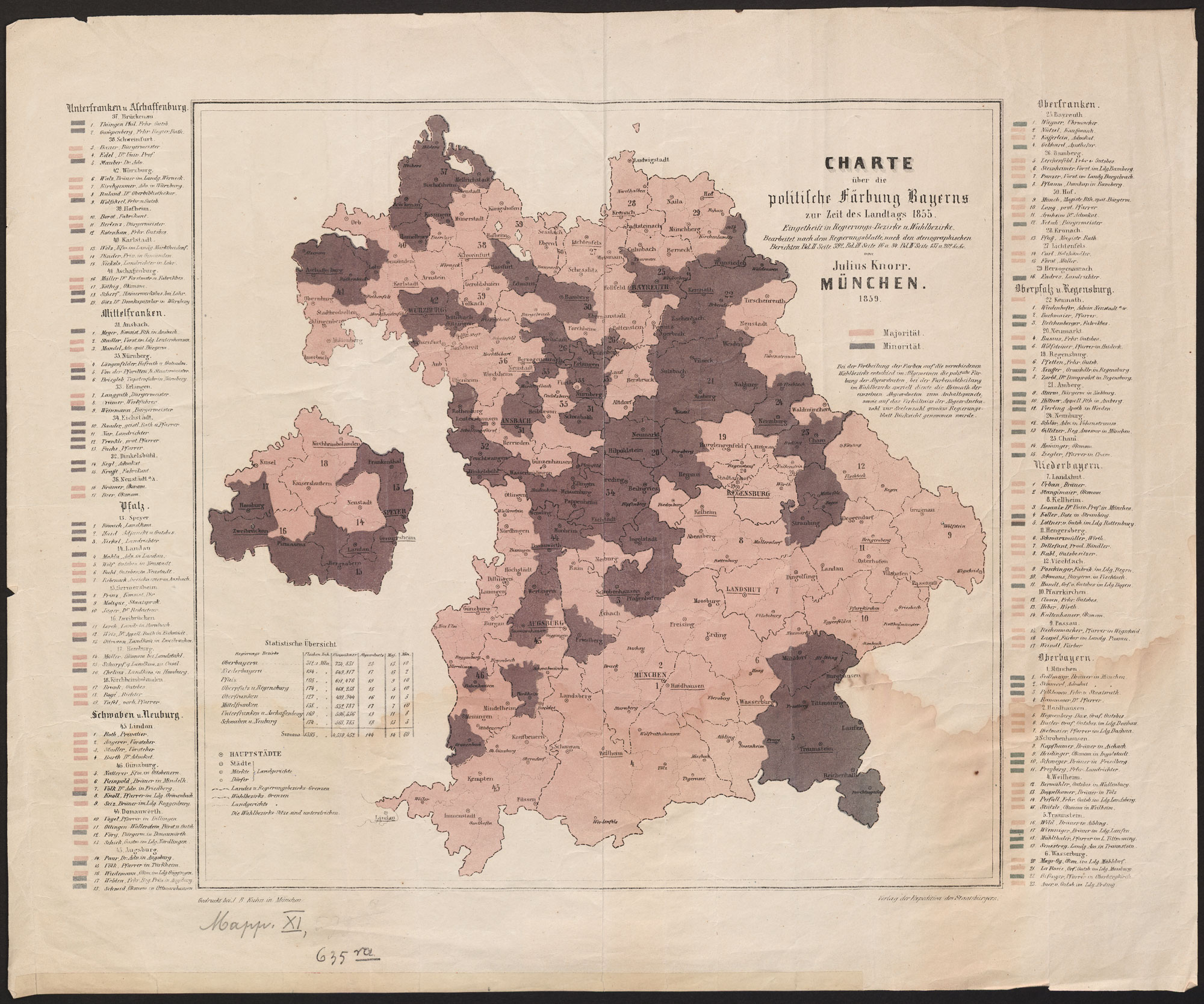 Auf der Karte sind die alten Wahlkreise vor der Reform 1906 zuerkennen. (Charte über die politische Färbung Bayerns zur Zeit des Landtags 1855: eingetheilt in Regierungs-Bezirke u. Wahlbezirke, Bayerische Staatsbibliothek Mapp. XI,635 ra)