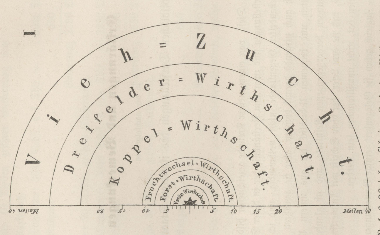 Die Thünschen Ringe. In: Johann Heinrich von Thünen, Der isolirte Staat in Beziehung auf Landwirthschaft und Nationalökonomie. Erster Theil. - 3. Auflage. - Berlin, Wiegandt, Hempel & Parey. - S. 390. (Thünen-Museum-Tellow) Urheberrechtliche Lizenz muss beim Rechteinhaber eingeholt werden.