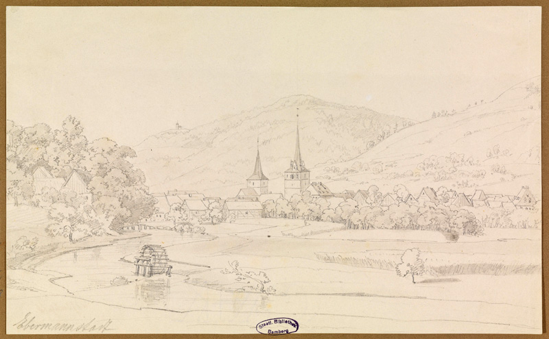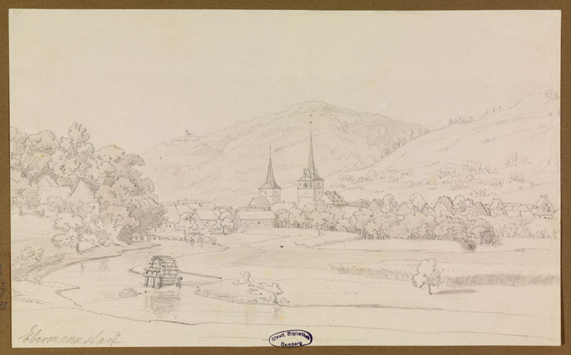 Der Bezirksarzt von Ebermannstadt (Lkr. Forchheim) Mathias Jaudt (1804-1877) schildert neben der Geschichte der Städte in seinem Bezirk auch das milde Klima und die Auswirkungen auf die Gesundheit. Die Zeichnung von Carl August von Lebschée (1800-1877) zeigt den Ort Ebermannstadt. (Staatsbilbiothek Bamberg, I T 135/38 lizenziert durch CC BY-NC 4.0) HLB