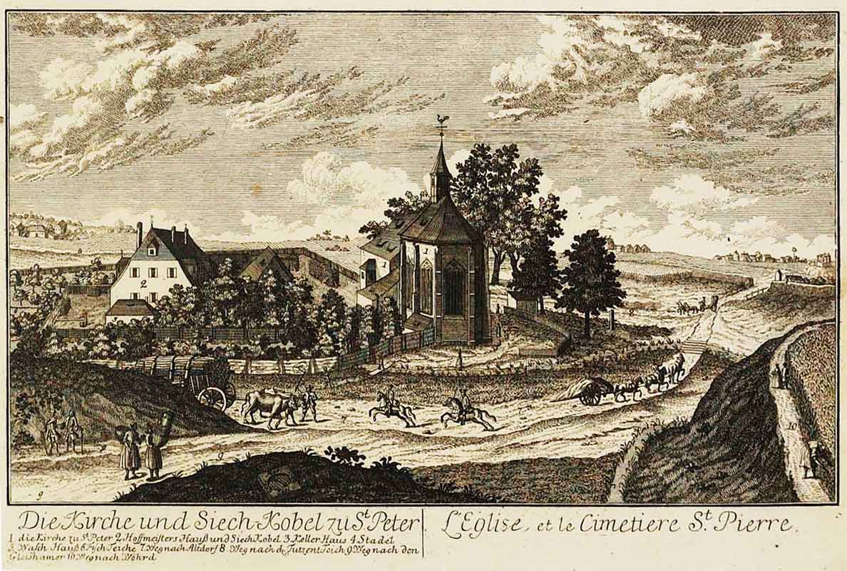 Kirche und Siech-Kobel zu St. Peter in Nürnberg auf einem Kupferstich aus dem Jahr 1760. In sogenannten Leprosorien waren die von Lepra befallenen Menschen untergebracht, versorgt wurden sie vor allem mit Almosen aus der Bevölkerung. (Deutsches Medizinhistorisches Museum Ingolstadt, Inventarnummer GT/0750) HLB