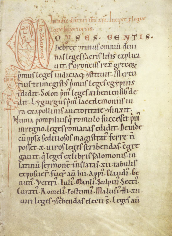 Deckblatt der Lex Baiwariorum (oder Baiorariorum). Dieses wichtigste Gesetzeswerk für das frühmittelalterliche Bayern stützt sich in vielen Aspekten auf westgotische Codices. Es handelt sich damit um den ersten nachweisbaren bedeutenden Kontakt Bayerns mit dem Kulturkreis der iberischen Halbinsel. Wie dieser Wissenstransfer vonstattenging, ist in der Forschung umstritten. (Bayerische Staatsbibliothek, Clm 3519, fol. 1r) HLB